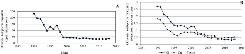 Рисунок 2 – Динамика атмосферных выбросов SO₂ (А), твердых веществ и Ni, Cu (B) (по данным [18])