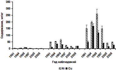 В ненарушенных сосновых лесах на Кольском Севере в органогенном горизонте Al-Fe-гумусовых подзолистых почв содержание подвижных форм Ni и Cu составляет в среднем 10 мг/кг (рис. 3). Эти концентрации тяжелых металлов были приняты нами за фоновое содержание [6]. В 1–4-летней хвое P. sylvestris и листьях доминантных видов кустарничков за исследованный период содержание этих загрязнителей изменялось в пределах: Ni – с 16,1 до 1,5 мг/кг и Cu – с 11,7 до 2,5 мг/кг абсолютно сухого вещества. Эти величины находятся в интервале региональных фоновых концентраций и соответствуют нормальному содержанию этих элементов в растениях [21; 2; 22–24].