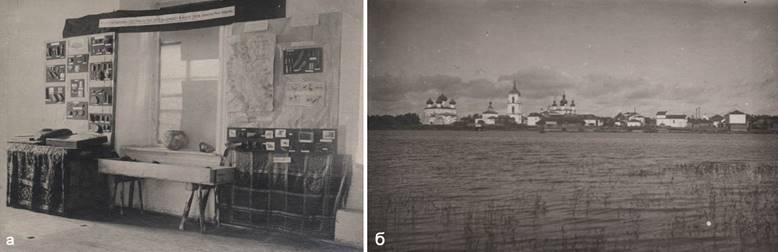 Рисунок 2 – a. Г. Каргополь. б. Вид экспозиции Каргопольского музея. Фото. [12, л. 9, 11]