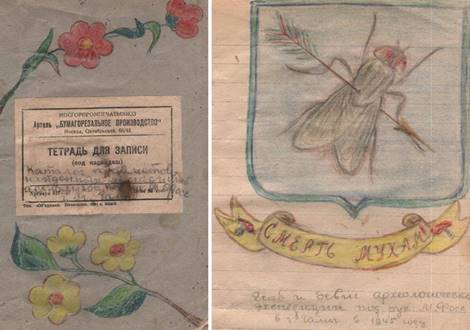 Раскопки Фосс совмещала с разведками. Свидетельством ее параллельной научно-исследовательской и организационной деятельности являются черновые финансовые документы – записи о расчетах с рабочими, закупке продовольствия, оплате транспорта (ж.д., пароход, лодка, лошадь). Документация сопровождается фотографиями раскопок и разведок, в том числе раскопа на стоянке Кубенино 1928 г. [13, л. 205–206], городища Валушки 1929 г. [14, л. 21], стоянки Бисерово 1951 г. [15, л. 86, 99]. Интересно, что сама М.Е. Фосс всегда оказывается при съемках где-то на заднем плане. Так в полевом дневнике Галичской экспедиции 1945 г., писавшемся по-видимому в вечерние часы у свечи или костра (л. 17 в центре прогорел), зафиксировано: «4–5.08. Проведено обследование дюны со стоянкой Умиление. Одновременно перевезен экспедиционный груз из багажной конторы на базу экспедиции. 6.08. Устройство жилья и лаборатории 7.08. Осмотр дюн 8.08. Поездка в город за рабочими 9.08. Силами экспедиции начаты раскопки». [9, л. 19]. На обложке дневника яркими цветными карандашами нарисованы цветок, ночной лес, а первый же лист открывается изображением мухи, пронзенной стрелой и словами: «Смерть мухам! Герб и девиз археологической экспедиции под рук. М. Фосс в г. Галич в 1945 году» (рис. 3).
