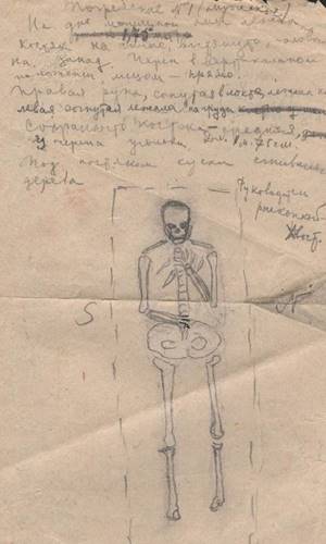 Рисунок 4 – Полевой дневник с зарисовкой костяка из кургана у с. Никитское. Рукоп. Карандаш. Автограф М.Е. Фосс. 7.09.1924 г. Справа надпись: «Руководитель раскопкой – Хвост» [16, л. 7 об.]