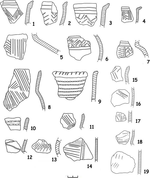 Рисунок 1 – Керамика стоянок Николо-Перевоз I и II: 1–7 – фатьяноидная 1, 8–14 – фатьяноидная 2, 15–19 – фатьяноидная 3