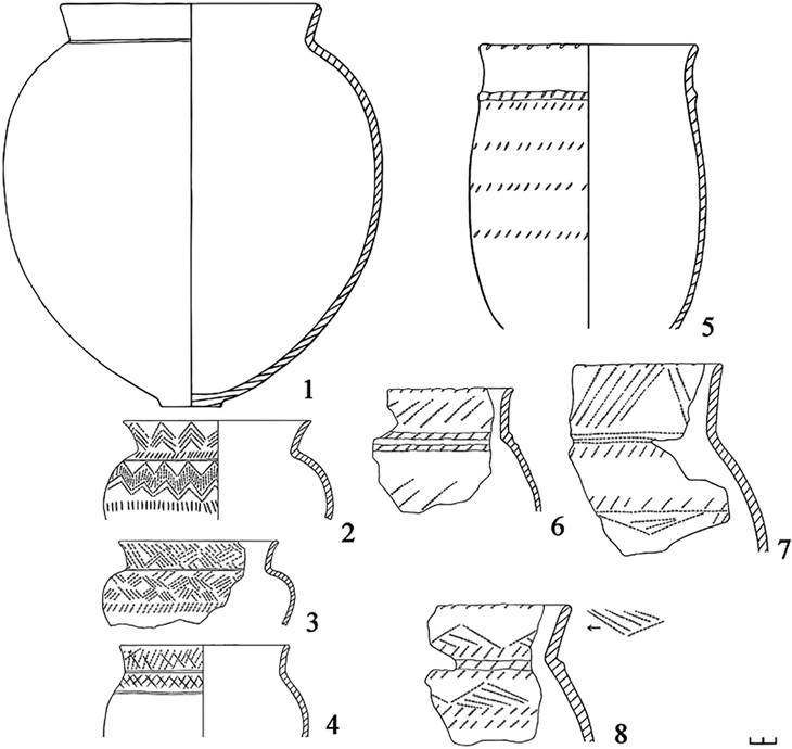 Среди фатьяноидной керамики можно выделить три группы: фатьяноидная 1, фатьяноидная 2 и фатьяноидная 3. В керамике фатьяноидной группы 1 (23 сосуда) фатьяновские традиции сочетаются с ошпандинскими (рис. 1: 1–7). К ошпандинским традициям относятся: 1) частое использование орнаментального образа «горизонтальная прямая линия» в виде широкой канавки на внешней губе сосуда, 2) орнаментальный образ «вертикальная прямая линия» также выполнялся подобной канавкой, 3) образ «заштрихованный треугольник вершиной вниз» отличается от фатьяновского своими удлиненными пропорциями, 4) частое использование нетрадиционного для фатьяновской культуры сочетания инструментов для орнаментации одного сосуда: зубчатого и гладкого штампов, а также небольшого стержня с притупленным концом, которым прочерчивались канавки и делались вдавления.