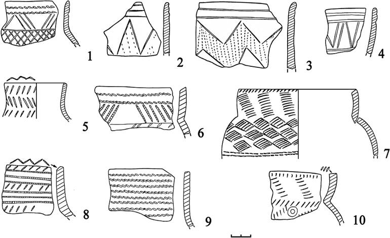 Остановимся на керамике группы фатьяноидная 2 (рис. 3: 5–10). В основном это тонкостенная посуда, часто за счет выбивания стенок. Сосуды имеют высокую шею, иногда волнообразную губу. В 10 случаях (13%) шея немного выпуклая. Декорирование поверхности неполное, достаточно широко применялся длинный широкий или узкий зубчатый штамп (51% всех орнаментированных сосудов); также отпечатки наносились шнуром, обмотанным вокруг тонкого инструмента, оставляющим отпечаток, близкий зубчатому штампу, но не такой четкий (20%); собственно шнуром (12%); гладким штампом, включая ногтевые отпечатки (12%), и ножом (8%). На одном фрагменте вместе с прочерчиванием и гладким штампом есть ямочные вдавления. Очень часто орнаментированы торец губы и внутренняя поверхность губы и шеи. В этой группе наиболее массовыми орнаментальными образами были: «горизонтальный ряд вертикальных или наклонных линий», «горизонтальный зигзаг» и «горизонтальная прямая линия». Хотя также часто встречаются различные образы ромбов: неоконтуренный и оконтуренный длинный (20%). Заметим, что на фатьяноидной керамике стоянок Николо-Перевоз ромбов нет вообще.