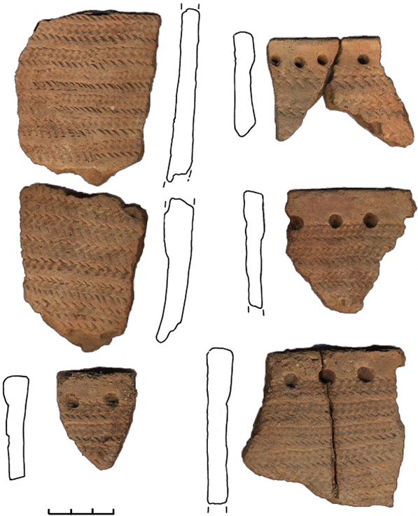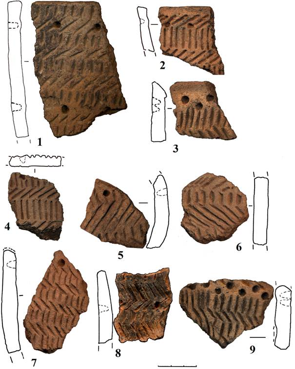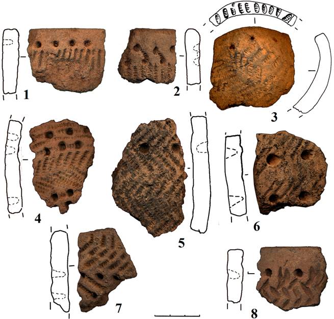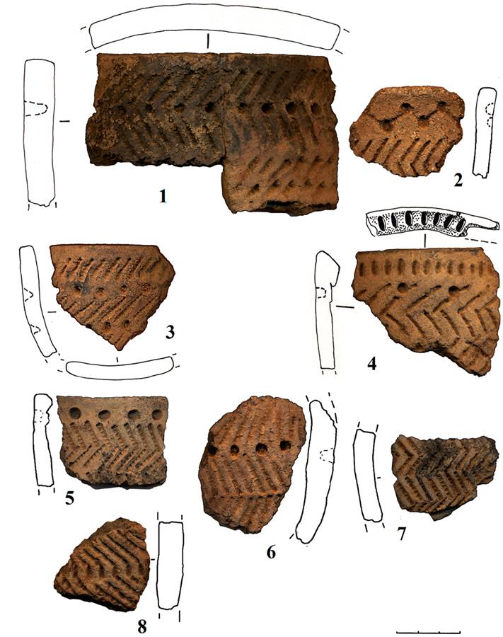 – горизонтальные пояса наклонно вправо и влево поставленных отпечатков веревочки, образующих вертикальные зигзагообразные линии с нанесенными поверх одиночными круглоконическими ямками (рис. 5: 1–7);