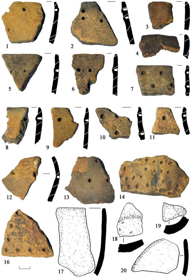 В.П. Левенок разделил культурный слой стоянки на относительные горизонты (по 20 см каждый). Всего их было выделено семь. В двух нижних им обнаружено три профилированных венчика (рис. 2: 7, 10, 11), один закрытый (рис. 2: 2) и восемь от прямостенных или же яйцевидных (рис. 2: 1, 3–6, 8, 9, 17) сосудов. По характеру оформления среза венчики распределяются в одном случае на плоские (рис. 2: 2), в двух – чуть приострённые (рис. 2: 6, 9), а в остальных – с округлым краем. Выявлено два днища, первое – приострённое и без орнамента (рис. 2: 19), второе было плоским при этом орнаментировано мелкими наколами овальной формы (рис. 2: 18). В этом же горизонте обнаружен обломок керамического лощила или скребка (рис. 2: 20). Следует отметить, что все фрагменты, исключая одно днище и несколько стенок (рис. 2: 14) не орнаментированы. Керамика украшена по верху сосудов одним (рис. 2: 1, 5, 6, 8, 9, 11) или двумя рядами овальных ямок (рис. 2: 2, 7, 10, 13).