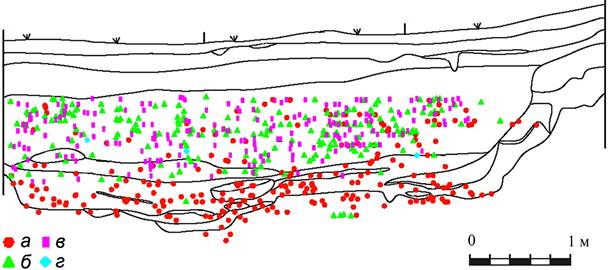Рисунок 1 – Стратиграфическое распределение неолитической керамики в объекте 21 Кокшаровского холма. а – керамика кошкинской культуры; б – керамика кокшаровско-юрьинской культуры; в – керамика полуденской культуры; г – керамика басьяновского типа