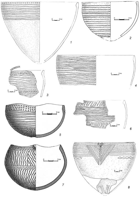 Рисунок 2 – Кокшаровский холм. Керамика кошкинской и кокшаровско-юрьинской культур. 1, 2, 4, 8 – кошкинская культура; 3, 5–7 – кокшаровско-юрьинская культура