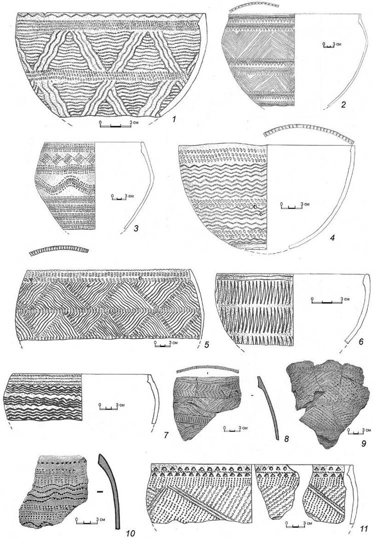 Рисунок 3 – Кокшаровский холм. Керамика кокшаровско-юрьинской и полуденской культур. 1, 4, 8, 9 – кокшаровско-юрьинская культура; 2, 3, 5–7, 10, 11 – полуденская культура