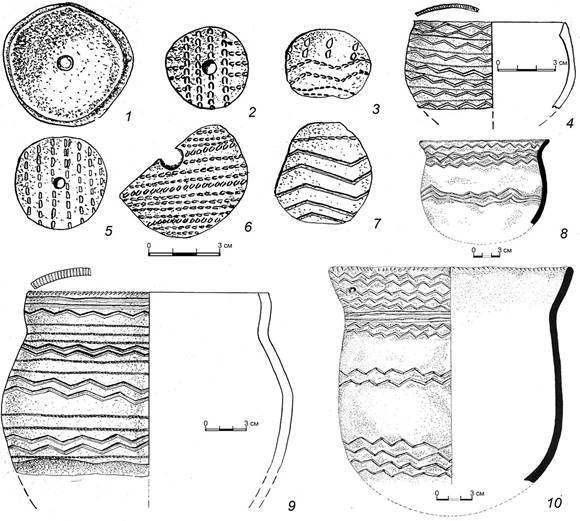 Рисунок 4 – Изделия из глины и керамика боборыкинской культуры. 1–7, 9 – Кокшаровский холм; 8, 10 – Ташково III. 1–3, 5–7 – пряслица; 4, 9 – керамика басьяновского типа; 8, 10 – керамика боборыкинской культуры (по [13, рис. 66, 67])