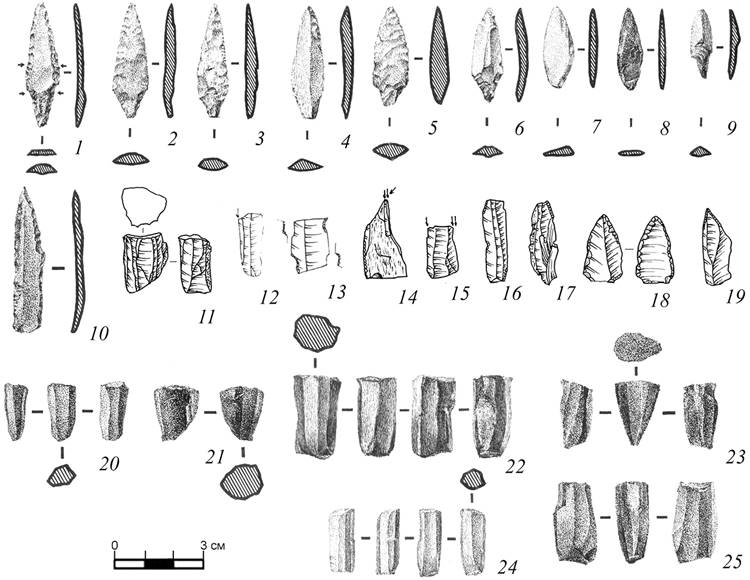 Рисунок 5 – Каменный инвентарь Кокшаровского холма. 1–9 – наконечники стрел; 10, 18, 19 – острия; 12, 14, 15 – резцы; 13, 16, 17 – резчики; 11, 20–25 – нуклеусы