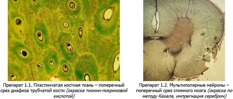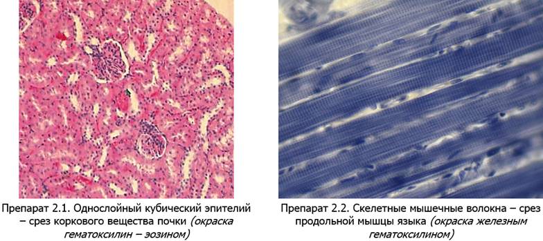При микроскопическом исследовании и интерпретации гистологических препаратов следует учитывать, что поскольку многие тканевые структуры толще среза, то некоторые их детали могут отсутствовать на конкретном срезе и что структуры в пределах ткани обычно попадают в срез случайно. Вид различных трехмерных тканевых структур (извитой трубки или шара) на тонких срезах может выглядеть практически одинаково [33, с. 35–36]. Многие гистологические препараты представляют собой продольный или поперечный срезы органов, на которые попадают не только отдельные ткани (например, срез спинного мозга, сердечной мышцы или сухожилия), но и комплексы разных типов тканей (например, срез стенки кишечника или трахеи, срез почки). Так, микропрепарат «Многослойный плоский ороговевающий эпителий (срез кожи пальца человека)» включает не только эпидермис, но и подлежащую соединительную ткань с кровеносными сосудами, нервными окончаниями и подкожной жировой клетчаткой, т.е. дерму. Исключение составляют тотальные препараты, например пленчатый препарат «Однослойный плоский эпителий – мезотелий (сальник кролика)», а также мазки крови и костного мозга, представляющие собой строго определенный тип ткани.