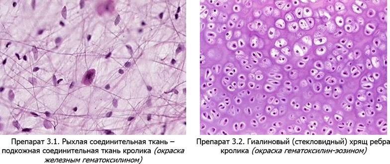 1 | Соединительные ткани. Рыхлая соединительная ткань – подкожная соединительная ткань кролика. | – много межклеточного вещества; – пучки толстых коллагеновых волокон; – тонкие эластические волокна; – большое количество разнообразных клеток: фибробласты, гистиоциты, лимфоциты |