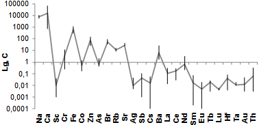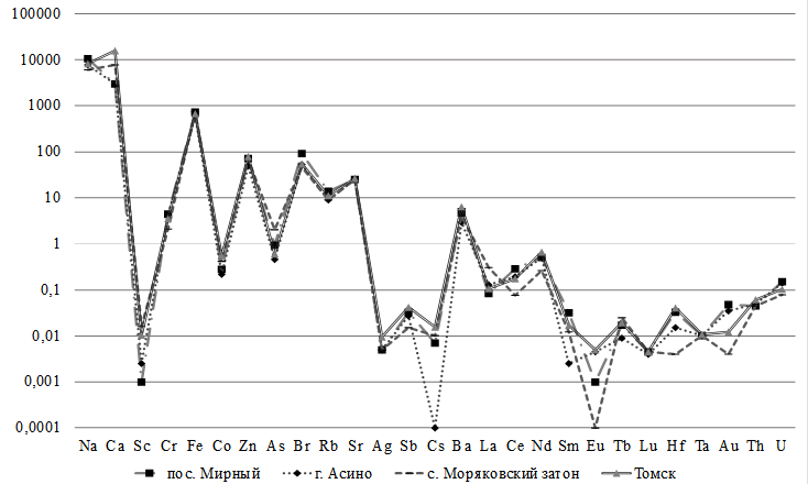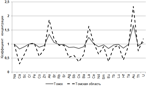 г. Томск | Au₁₇ – As₁ˏ₃ – La₁ˏ₂ – U₁ˏ₁ = Br – Ce₁ˏ₀ = Fe = Cr = Na = Lu = Rb = Sr = Ta = Sm = Tb |