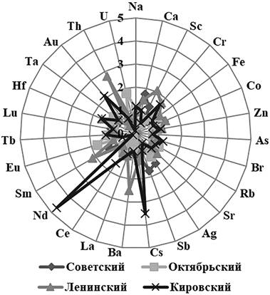 Сравнительная диаграмма концентрирования изученных элементов в плацентарной ткани жительниц изученных районов города Томска (рис. 3) демонстрирует, что именно Ленинский район является зоной, в биоматериалах жительниц которой аккумулируется наибольшее содержание химических элементов. Изученный биоматериал из Ленинского района накапливает больше Ca, Sc, Cr, Fe, Co, Zn, Ba, La, Hf, Th. Пробы из Кировского района отличаются содержаниями Na, Br, Cs, Ce, Nd, Eu, Au, из Октябрьского – Ta и U. Особенностью Ленинского района является большее содержание Rb, Ag, Lu.