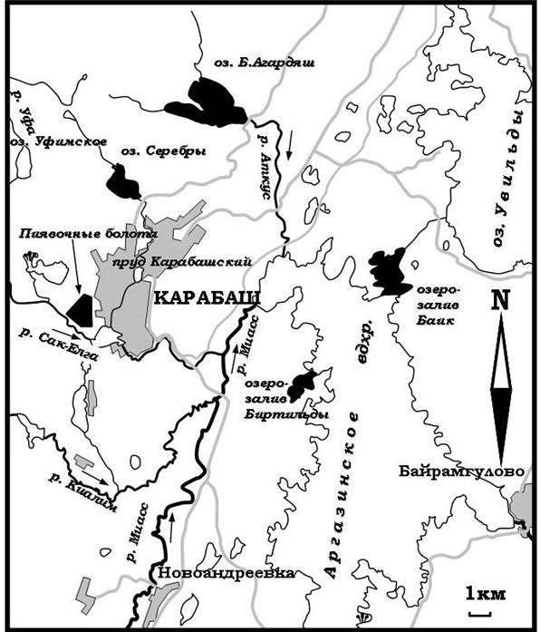 Рисунок 1 – Исследованные водоёмы окрестностей г. Карабаш Челябинской области (выделены чёрным)