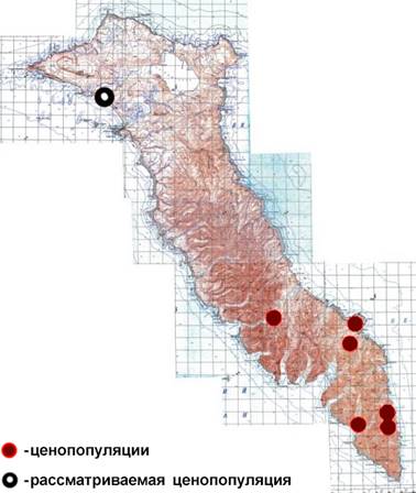 Рисунок 2 – Местонахождение ценопопуляций C. macranthon на острове Беринга