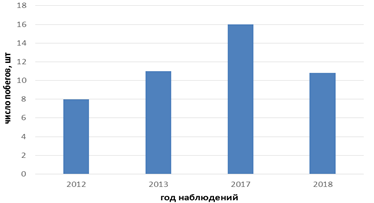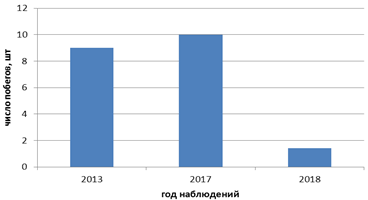 Численность побегов в разные годы составляла от 8 до 16 особей на 1 м² (рис. 5). В 2012 году среднее количество побегов на 1 м² составило 8 особей. Количество цветущих побегов в этот год не учитывалось. В 2013 году среднее количество побегов немного увеличилось и составило 11 особей на 1 м². В 2017 году наблюдалось максимальное количество побегов за годы исследований – 16 особей на 1 м². В 2018 среднее количество побегов на 1 м² составило 10,8 особей. Среднее количество генеративных побегов в 2013, 2017, 2018 гг. составило 9, 10 и 1,4 особей соответственно (рис. 6). Генеративность ценопопуляции является одной из важнейших характеристик ее жизненного состояния. Величина этого показателя в годы наблюдений колебалась от 81,8% до 12,9%. Наивысший коэффициент генеративности отмечен в 2013 г. – 81,8%; наименьший в 2018 г. – 12,9%. Для 2017 г. показатель составил 62,5%. Вероятно, климатические условия на протяжении вегетационного сезона в 2013 г. были более благоприятным (более высокие температуры и достаточное увлажнение) в сравнении с 2012 и 2018 гг.