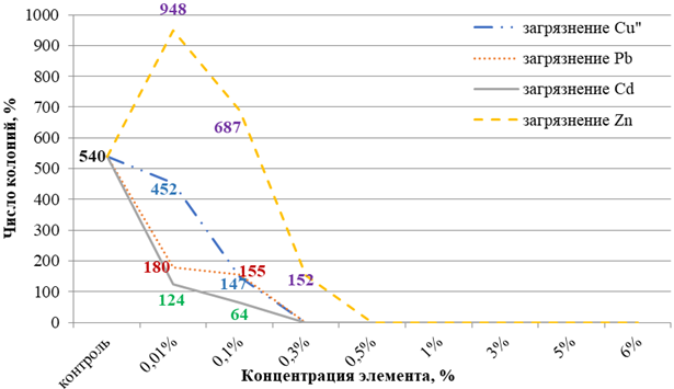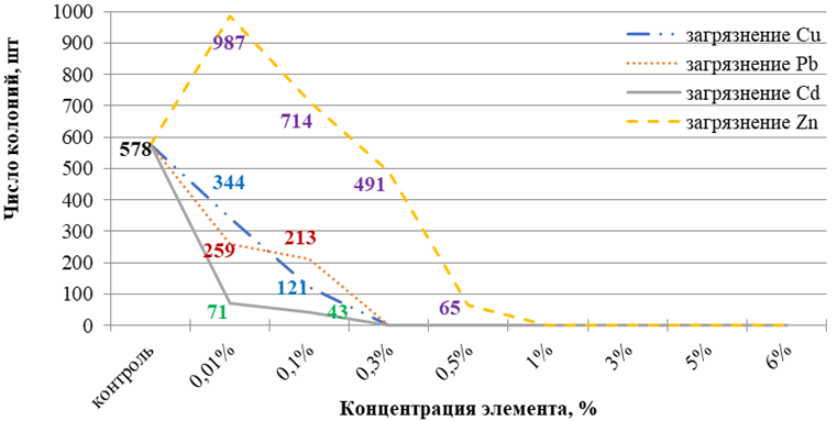 Бактерии выращивались в лабораторных условиях при температуре 26°C. Посев производили в чашки Петри из ризоторфина при десятикратном разбавлении на плотной питательной агаризованной среде, обогащенной солями тяжелых металлов, (г/л: горох – 50; вода – 1; агар – 20; сахароза – 10; К₂НРО₄ – 0,5; и количество соли, соответствующее изучаемому варианту). Для моделирования загрязненной тяжелыми металлами среды использовали легкорастворимые соли: нитрат свинца, сульфат меди, сульфат цинка и нитрат кадмия в концентрации 0,01%; 0,1%; 0,3%; 0,5%; 1%; 3%; 5%; 6%. Повторность опыта трехкратная. Контролем служили чашки Петри с питательной бобовой средой без солей тяжелых металлов. Подсчет колоний проводили на 4 сутки [17–21; 22, с. 164–176].
