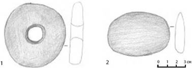Рисунок 4 – Поселение Вигайнаволок I: 1, 2 – гальки шлифованные, сланец