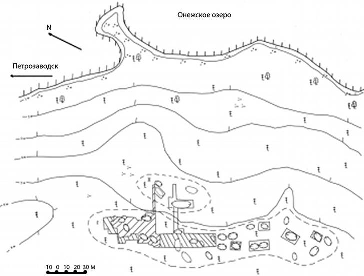 Показательны 18 жилищ с ямочно-гребенчатой и ромбо-ямочной керамикой на поселениях Пегрема I–III, VII, X, XXII, XIX, XXXIII Заонежского полуострова [14]. А.П. Журавлевым отмечено, что жилища идентифицированы по впадинам округлой формы, просматриваемым на современной поверхности. Постройки подквадратной формы, за исключением одной округлой формы на стоянке Пегрема XIX, углублены на 0,3–0,5 м, ориентированы в направлении З–В, ЮВ–СЗ. Размеры варьируют от 16 до 100 м². Входы располагались чаще всего в восточных стенках к озеру. На Пегреме VII выход отмечен в южной стенке, а на Пегреме X выложен камнями в западной стенке, потом резко поворачивает на север. На Пегреме XIX два входа – на СЗ и ЮВ, на Пегреме XXXIII – направлен к озеру в северо-восточной стенке. Размеры средние 2 × 1,5 м. Кроме одного жилища на поселении Пегрема VII, все остальные относятся к однокамерным. В данном случае это пример единого комплекса, образованного коридором (2 × 2 м) от южной стенки с жилищем 2 с ямой-погребением (?) (2,0 × 0,7 × 0,4 м, ориентация ЮВ–СЗ) в центре. Практически на всех зафиксированы кострища и/или очаги, чаще всего в центре или у выхода. Находки концентрируются на разных участках площадок.