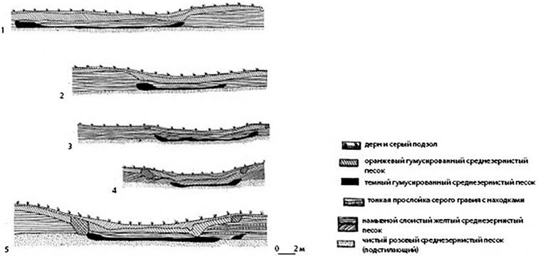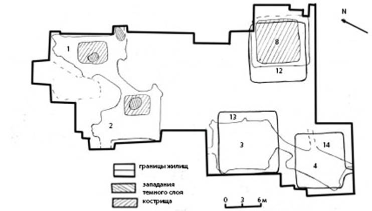 Основные различия между ними сводятся к следующим показателям. Жилищные постройки среднего неолита прослежены по линзам гумусированного песка, а более поздние – по углистым полосам. По плану жилища с ямочно-гребенчатой керамикой локализуются в северной части поселения, остальные размещаются по всей площади, в том числе на месте более ранних. Двухкамерные постройки, соединенные коридорами, содержат материал среднего неолита. По размерам эти жилища значительно уступают поздним. Площадки в виде западания гумусированного песка мощностью до 0,15 м (следы напольного настила) зафиксированы в ранних постройках.