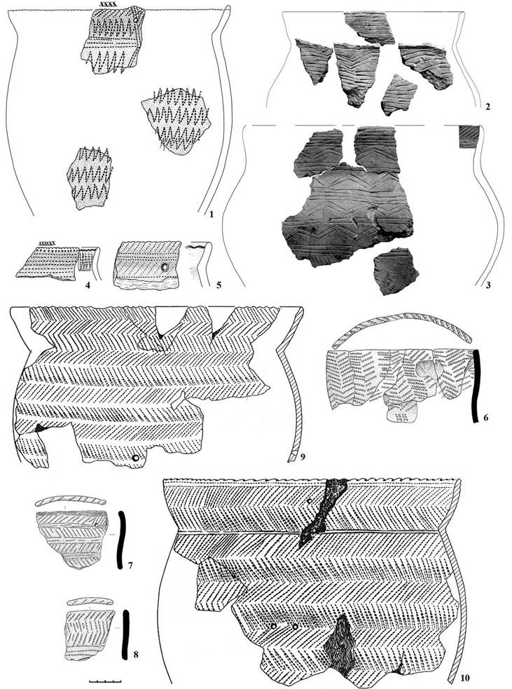 Рисунок 3 – Керамика маханджарского типа. 1–5 – пос. Усть-Суерка-4 (из готовящейся к публикации монографии); 6–8 – пос. Увал 5; 9–10 – пос. Ук 6 [8]