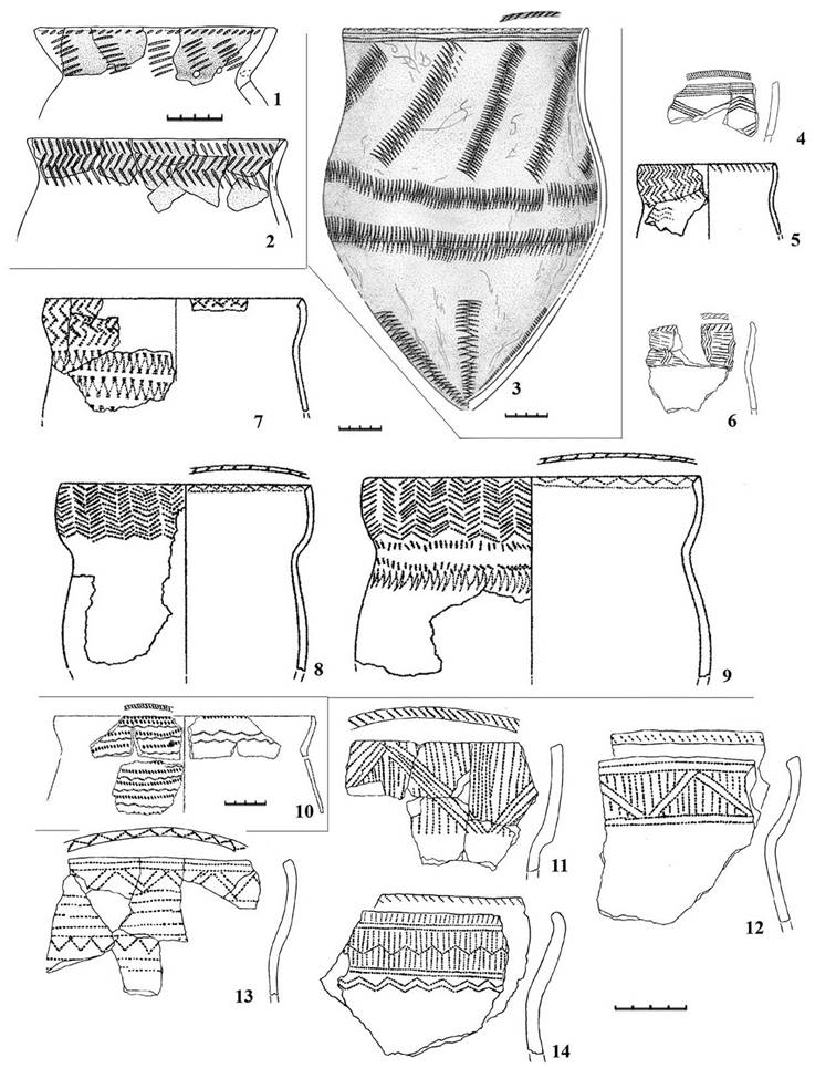 Рисунок 5 – Керамика маханджарского типа. 1–2 – пос. Ташково 1; 3 – пос. Мергень 7 (по [5]); 4–14 – пос. Бестамак [3, с. 96, рис. 35: 4, 6, 9–12, с. 98, рис. 36: 1–3, 5, 7]
