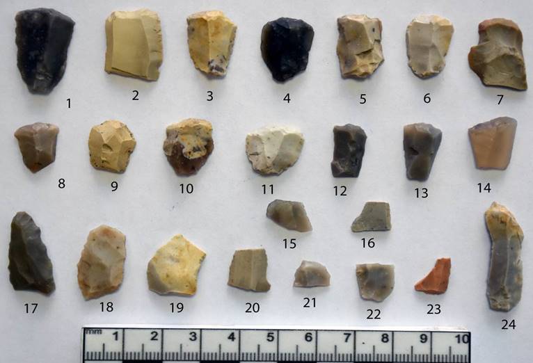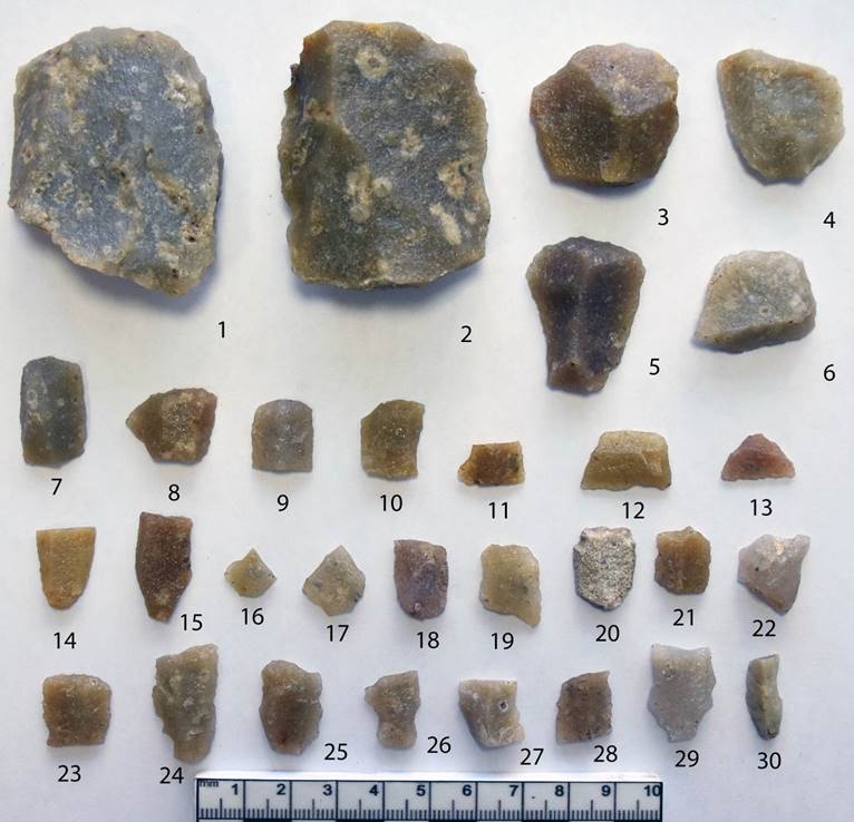 Обломки отщепов и пластин (95 экз.), преимущественно размерами 2–3 см – 18 экз. и 1–2 см – 62 экз.