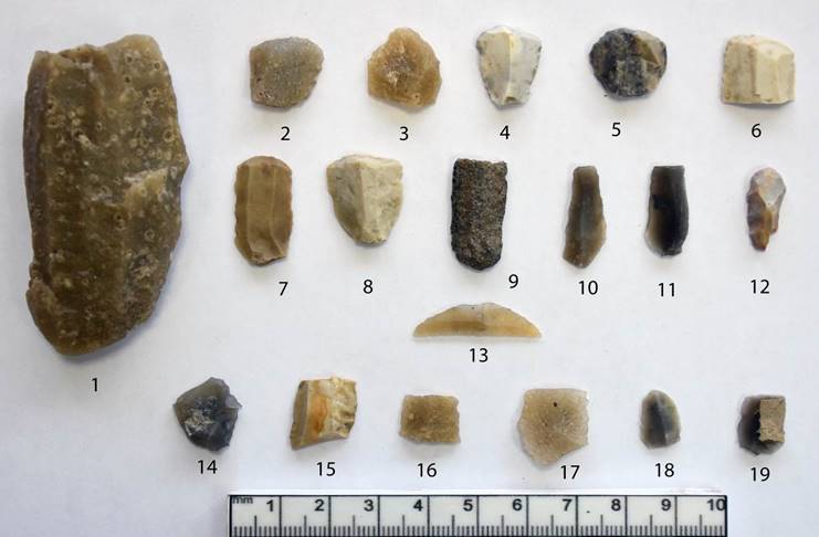 В горизонте выявлено 9 целых вторичных отщепов без вторичной обработки, размерами от 2 до 5 см, есть массивные формы, размерами 35,9 × 36,9 × 16,9 мм, 6 чешуек размерами около 1 см.