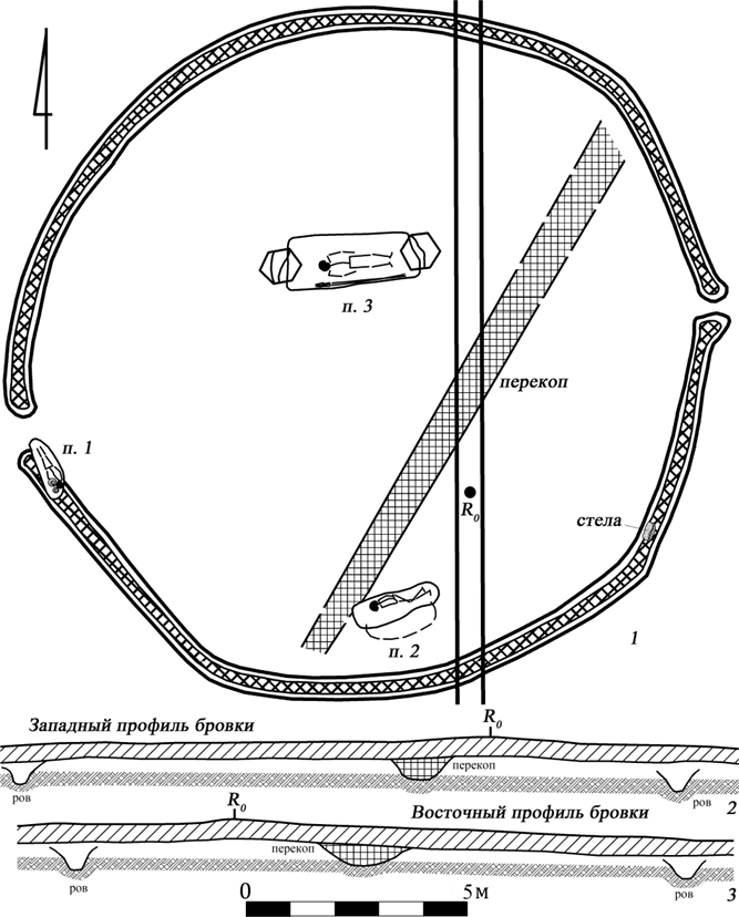 Погребение 1 (сарматское, впускное) обнаружено в 9,5 м на запад от R₀, захоронение перерезало оконечность южной дуги кольцевого рва.