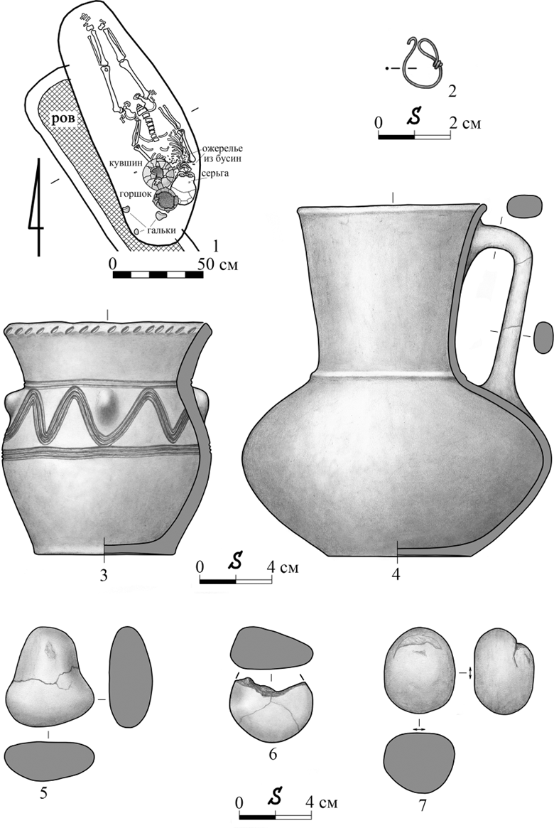 Рисунок 2 – Сарматское погребение 1 кургана 12 группы «Сад» (1), серьга (2), лепной горшок (3), гончарный кувшин (4), гальки (5–7)