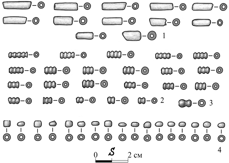 Рисунок 3 – Ожерелье: пронизи (1), зональные бусины (2), двухчастная бусина (3), округлые и уплощённые бусины (4)