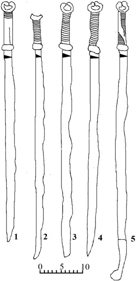 Среди оружия, попавшего в могилы, представляют интерес палаши, рукояти которых были снабжены перекрестиями и навершиями антенновидной (калачевидной) формы. Подобное оружие обнаружено в ходе раскопок погр. 71, 78, 79 Ныргандинского II, погр. 733, 1317 Тарасовского, погр. 133, 143 Афонинского (рис. 1: 4–5), погр. 7 Чегандинского II могильников [1, с. 9; 2, с. 2, 3; 3, табл. 329: 19, табл. 509: 10; 4, рис. 3; 5, табл. XI: 1].