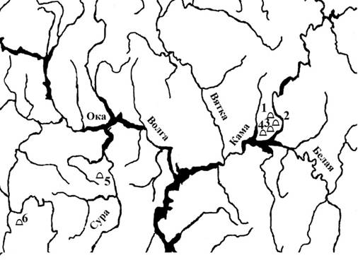 Рисунок 2 – Территория распространения палашей в Волго-Камском междуречье. 1 – Афонинский могильник; 2 – Тарасовский могильник; 3 – могильник Нырганда II; 4 – могильник Чеганда II; 5 – Андреевский курган; 6 – Кошибеевский могильник