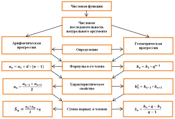 В девятом классе подробно изучаются числовые последовательности. На уровне содержания понятия арифметической и геометрической прогрессий вводятся как частные случаи числовой последовательности от натурального аргумента, которая, в свою очередь, является числовой функцией. Далее следуют формулы n-го члена, характеристическое свойство и формулы суммы первых членов прогрессии (рис. 2).