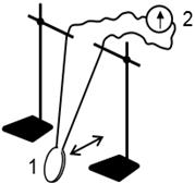 - Экспериментальная задача с демонстрационного стола. Оборудование: два штатива, катушка от прибора для демонстрации магнитных спектров тока (1), зеркальный гальванометр (2), длинные провода (рис. 12). Наблюдаемое явление: в процессе механических колебаний катушки стрелка зеркального гальванометра совершает колебательное движение, отклоняясь то вправо, то влево. Объясните этот эффект.