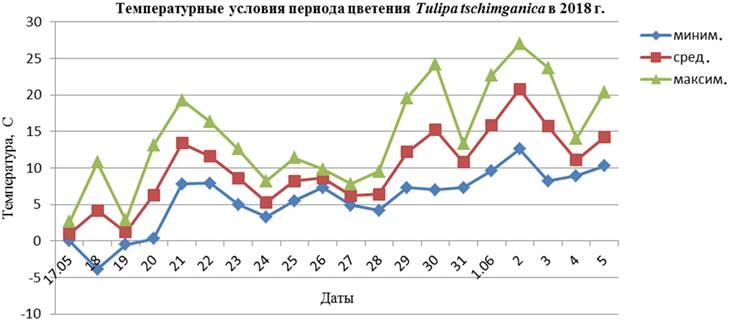 Тюльпаны являются весенними эфемероидами, которые используют накопленную влагу в почве и чувствительны к изменениям температурного режима. Согласно литературным данным [4], период цветения T. tschimganica в Ботаническом саду города Ташкент (Республика Узбекистан) (ex situ) отмечается со II декады марта, в коллекции ЦСБС СО РАН – в период с 2010 по 2019 гг. начало цветения наблюдалось во II декаде мая шесть раз. По продолжительности цветение можно характеризовать как короткое – 7–8 дней, средней продолжительности – 10–12 дней и длительное – 13–15 дней соответственно.