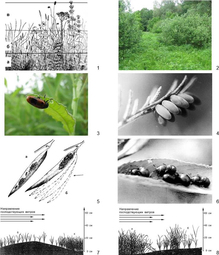 Рисунок 1 – Открытые и закрытые местообитания жуков-листоедов. 1 – типичный травостой открытых местообитаний жуков-листоедов (рис. Н. Роговой и С.И. Павлова): цифрами обозначены его ярусы: а – прикорневой, б – центральный, в – верхний; 2 – поляна в густом лиственном лесу – видны взрослые деревья (3-й ярус), ярко-зеленый подрост (2-й ярус) и кусты (1-й ярус) (фото О.В. Павловой); 3 – жук Clytra quadripunctata во время кормления прячется от солнца под листовой пластинкой (фото В.Н. Макаренкова); 4 – кладка листоеда Chrysolina graminis, размещенная в тени листа полыни высокой (фото С.И. Павлова); 5 – стратегия защиты от ветра личинок Plagiodera versicolora: а – в штиль или при слабом ветре личинки обычно рассредоточены по всей поверхности листа, б – во время сильного ветра личинки сползаются в плотную группу к основанию листовой пластинки, где амплитуда колебаний субстрата в 2–3 раза меньше, чем в привершинной части (рис. С.И. Павлова); 6 – во время внезапно начавшегося сильного ветра копулирующие жуки Plagiodera versicolora группируются на листе ивы, вдоль его центральной жилки (фото С.И. Павлова); 7 – заселение вышедшими из мест зимовки жуками Oulema melanopus пшеницы на стадии «всходов – кущения» (насекомые концентрируются в закрытом от ветра секторе «а») (рис. С.И. Павлова); 8 – перегруппировка имаго <>O. melanopus на посевах пшеницы на стадии ее «стеблевания» в более разреженный и лучше прогреваемый сектор «б» (рис. С.И. Павлова)