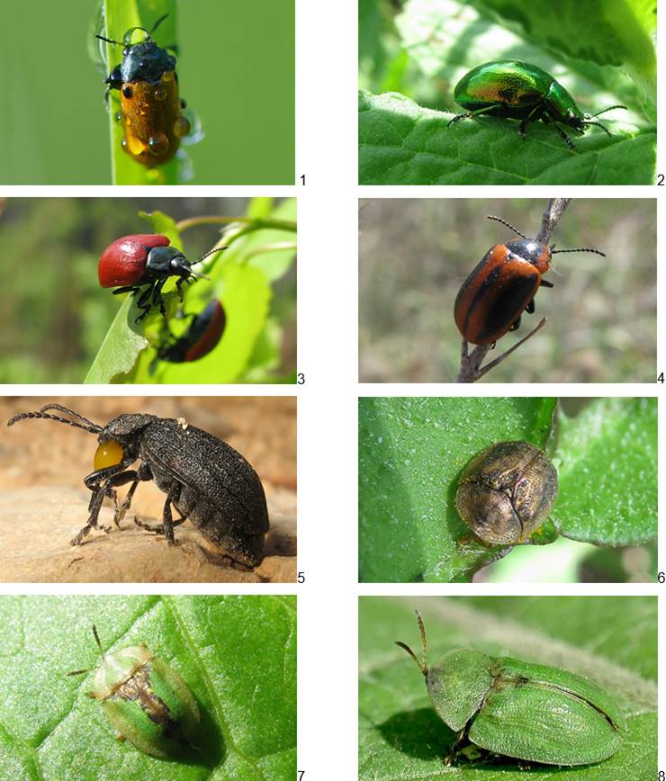 Рисунок 2 – Защитные адаптации и поведение хорто- и дендробионтов: 1 – застигнутый дождем жук Labidostomis humeralis принял соответствующую погодной ситуации защитную позу (фото В. Дмитриева); 2 – зеленый цвет покровов с яркой металлической иризацией хорошо скрывают жука Chrysolina menthastri от потенциальных хищников (фото В.Н. Макаренкова); 3 – широкое «поле» темно-красных надкрылий в сочетании с черными головой, переднеспинкой и ногами – надежный апосематический маркер для жука Chrysomela populi (фото В.Н. Макаренкова); 4 – еще более эффективным предостерегающим сигналом является комбинация красных «полей» и черных пятен и полос на покровах жука Entomoscelis adonidis (фото В.Н. Макаренкова); 5 – при внезапном появлении хищника, жук Galeruca tanaceti, не имеющий возможности экстренно скрыться, выделяет из ротового отверстия большую каплю ядовитой для врагов гемолимфы (фото Н.А. Березина); 6 – буро-желтые надкрылья с черными пятнами и перламутровым отливом успешно маскируют жука Cassida nebulosa среди пестрого травостоя (фото О.В. Павловой); 7 – камуфляж жука Cassida vibex настолько совершенен, что, если бы насекомое совсем не имело запаха, то оно было бы практически неуязвимо для своих врагов (фото В.Н. Макаренкова); 8 – покровы тела жука Cassida viridis до такой степени уплощены, что даже наружные края переднеспинки и надкрылий не загибаются кверху (фото К.В. Макарова)