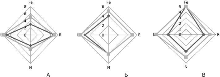 Рисунок 2 – Характеристика местообитаний изучаемых видов, баллы (по экологическим шкалам Элленберга). Условные обозначения: А – Polygonatum odoratum, Б – Convallaria majalis, В – Maianthemum bifolium. L – освещенность, Fe– влажность почвы, R – реакция почвы, N – обеспеченность почвы азотом. Светло-серым цветом обозначен диапазон экологического пространства исследованных ЦП; темно-серым цветом – диапазон экологического ареала по шкалам Элленберга