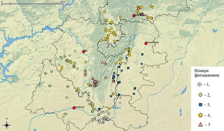 В результате кластерного анализа выделено 5 типов сообществ (фитоценонов), отражающих основное разнообразие каменистых степей Южного и Среднего Урала и дифференцированных пространственно (рис. 1).