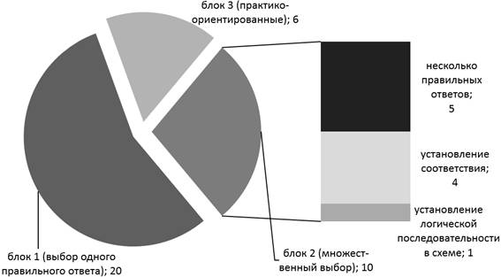 Задания блока 1 составляют 55% от общего количества олимпиадных задач и представлены тестовыми заданиями с выбором одного правильного ответа, позволяющими оценить базовый уровень знаний и возможность их применения для решения стандартных задач. 28% заданий приходится на блок 2 с задачами на множественный выбор правильных ответов. Задания данного типа характеризуются повышенным уровнем сложности, при решении которых необходимо критическое мышление. Определенную трудность при выполнении заданий данной группы вызывает отсутствие указания конкретного количества правильных ответов, что исключает возможность использования метода исключения.