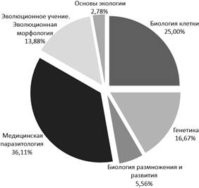 Однако некоторые задания оказались достаточно трудными для студентов. Так, низкий уровень знаний продемонстрировали студенты при выполнении ряда заданий, связанных со знанием закономерностей реализации наследственной информации (средний балл не превышает 0,25 при максимально возможном 1), периодизацией онтогенеза человека (средний балл 0,34), а также некоторых заданий в области медицинской гельминтологии и арахнологии (средний балл 0,36 и 0,46 соответственно).