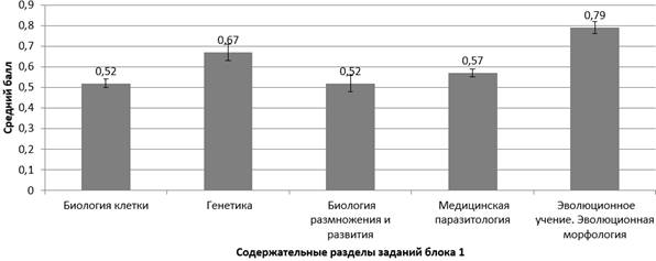Средний балл при выполнении заданий с выбором одного правильного ответа (блок 1) варьирует в пределах 0,52–0,79, при этом наилучшие результаты показали студенты при освоении таких разделов биологии, как «Генетика» (средний балл 0,67) и «Эволюционное учение. Эволюционная морфология» (средний балл 0,79) (рис. 3).