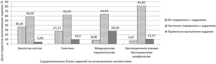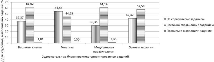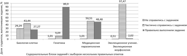 Для более полного представления об уровне биологической подготовки будущих врачей был проведен анализ выполнения заданий по каждому блоку заданий с учетом их содержательных особенностей, при этом считали элементы содержания освоенными, умения сформированными при выполнении задания не менее 50% [21, с. 14].