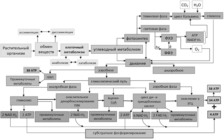 В первом блоке (светлая тонировка) отражена взаимосвязь и иерархия важнейших общебиологических понятий, одни из которых следует использовать при изучении целостного растительного организма («обмен веществ», «ассимиляция», «диссимиляция»). Другую триаду понятий («метаболизм», «анаболизм», «катаболизм») следует применять при изучении физиолого-биохимических процессов на клеточном уровне.