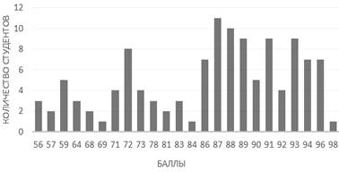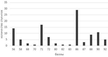 Несложно заметить, что в контрольной группе максимальные показатели сконцентрирована вокруг пороговых значений – 56, 71 и 86 баллов. Именно столько баллов необходимо набрать, чтобы получить оценки «удовлетворительно», «хорошо» и «отлично» соответственно. Студенты, набрав необходимое для получения положительной оценки число баллов, не стремились продолжить выполнять задания. Разительно отличаются итоги в экспериментальной группе (рисунок 2).