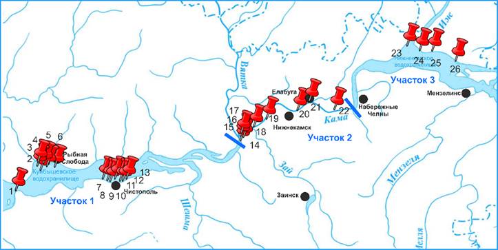 Рисунок 1 – Карта района работ на реке Кама в июле-августе 2016 г.