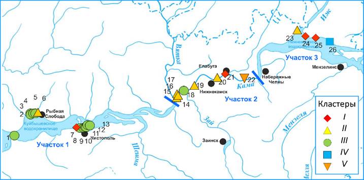 Река Кама – один из крупнейших притоков реки Волги, имеющий важное хозяйственное значение для Европейской части России. Длина водотока, по данным Государственного водного реестра (Гос), составляет 1805 км, водосборная площадь 507000 км². В реку Каму впадают более 100 рек и 50 озер. На реке создано три водохранилища и ГЭС. В нижнем течении реки, где проводились наши исследования, на реке Каме имеется два зарегулированных участка. Участок 1 (рис. 1) в устьевой части р. Камы от места впадения реки в Волгу до острова Сокольский (село Соколка) включается в Куйбышевское водохранилище. Выше по течению до плотины Нижнекамской ГЭС, расположен участок 2 (рис. 1) реки с довольно сильным течением. На данном отрезке реки в Каму впадает река Вятка. Выше плотины находится Нижнекамское водохранилище (участок 3, рис. 1). В пределах района исследования на берегах Камы расположены города Чистополь, Нижнекамск, Набережные Челны, Мензелинск и другие населенные пункты. На реке осуществляется судоходство и активно добывается песчано-гравийные смеси. Река Кама имеет высокое рыбохозяйственное значение. Все эти обстоятельства свидетельствуют о важном значении реки Камы и необходимости проведения постоянного мониторинга за экологическим состоянием вод.